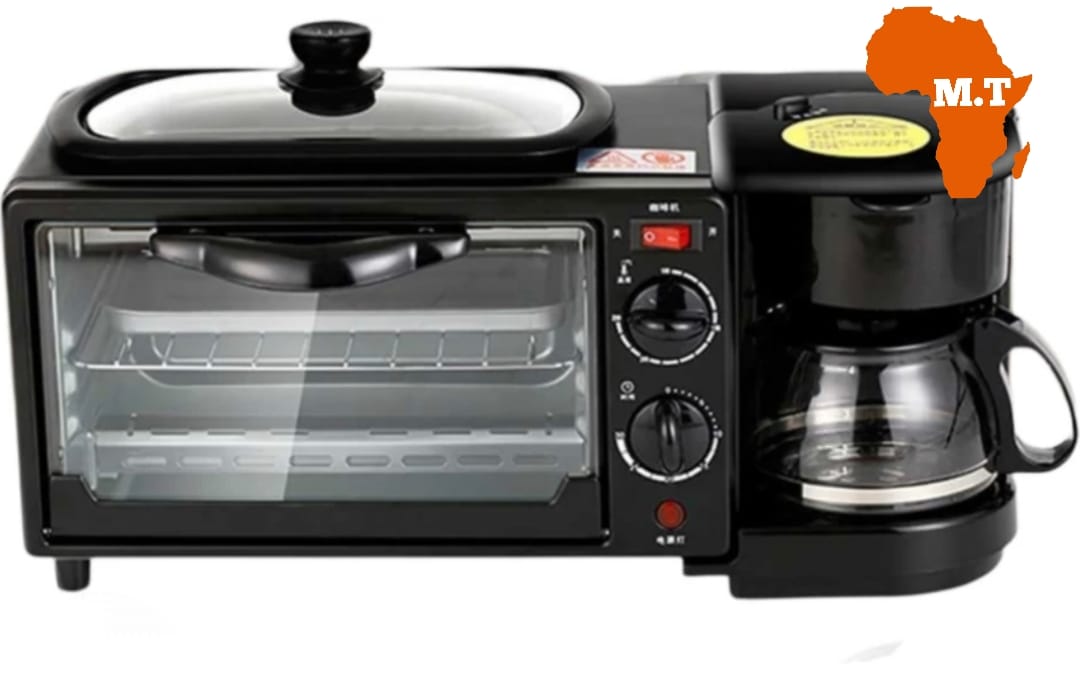 -This versatile breakfast station covers your entire morning breakfast! -This 3-In-1 Electric Breakfast Maker is an amazing small multi functional kitchen appliance that can make up to 6 cups of coffee, toast, bake, roast, or reheat food and even be used for pan cooking This versatile breakfast station covers your entire morning breakfast! -Coffee Maker -Frying Pan -Mini Oven Bread Pizza Oven -Toast, Fry Egg & Make Coffee -At Same Time Can Make Variety Of Baked -Goods & Stir-Fry -Frypan Lid Included -Adjustable temperature controls(ideally between 100 ℃ and 230℃) is straightforward enough that you can at least cook foods simple -With a maximum temperature of 230℃, you can even quickly brown the outside of a prime rib. Great at warming something up quickly -Features four stainless steel heating elements within the mini oven that helps provide even heat distribution for better cooking results -Fitted with a 5 blade fan, this solo microwave is exceptionally quiet during use, great for new parents who want to let their baby sleep -Takes up minimal space your kitchen counter top and can be easily stored away, making it perfect for smaller kitchens